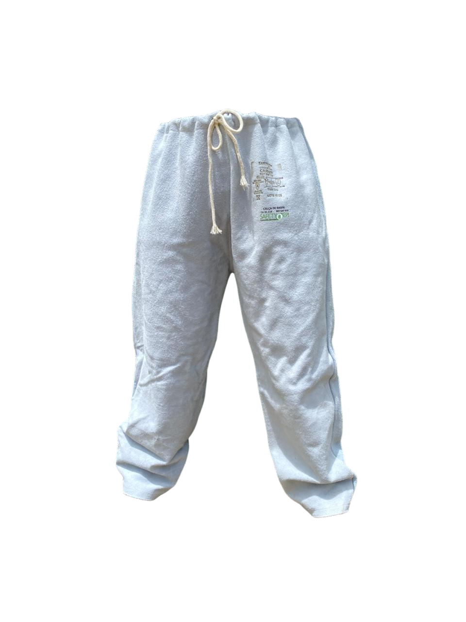 Calça de segurança confeccionada em raspa, com fechamento em velcro e cordão para ajuste na cintura, costura em linha de aramida.