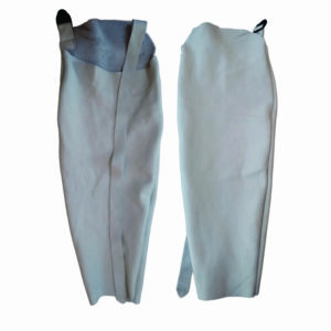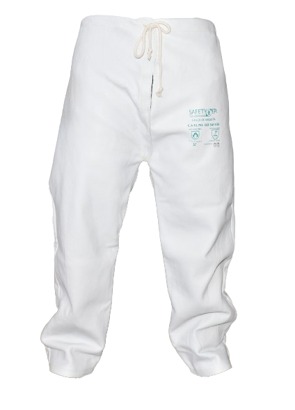VESTIMENTA DE SEGURANÇA TIPO CALÇA CONFECCIONADA EM VAQUETA, REGULAGEM EM CORDÃO DE ALGODÃO, FECHAMENTO FRONTAL EM VELCRO.