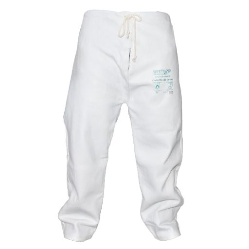Calça de segurança confeccionada em vaqueta, com fechamento em velcro e cordão para ajuste na cintura, costura em linha de aramida.