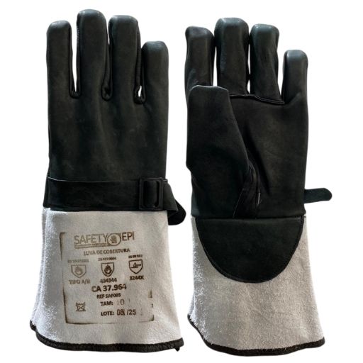 Luva de sobrepor confeccionada em vaqueta na face palmar e dorso, punho em raspa com reforço protetor de artéria em vaqueta, tira de reforço entre polegar e indicador. Possui tira para regulagem em vaqueta com fivela plástica para ajuste.
