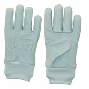 LUVA DE SEGURANÇA CONFECCIONADA EM VAQUETA MODELO MEIA FALANGE COM PUNHO DE MALHA.