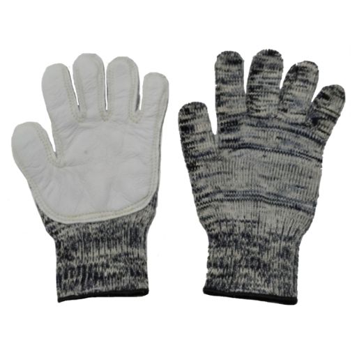 Luva de segurança tricotada em fios naturais e sintéticos com reforço na face palmar e dedos em vaqueta com fixação em costura dupla. Punho em elástico com acabamento em overloque.