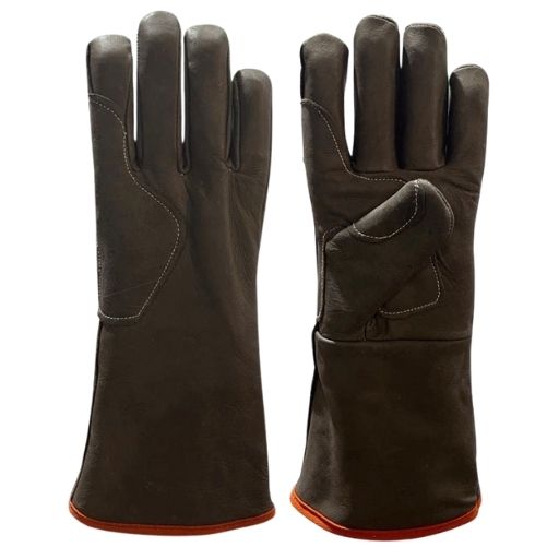 Luva de segurança confeccionada em raspa tingida, reforço externo de raspa entre os dedos polegar e indicador, dorso e punho sem emenda, forro em tecido de algodão em toda a luva, acabamento em tecido de algodão.